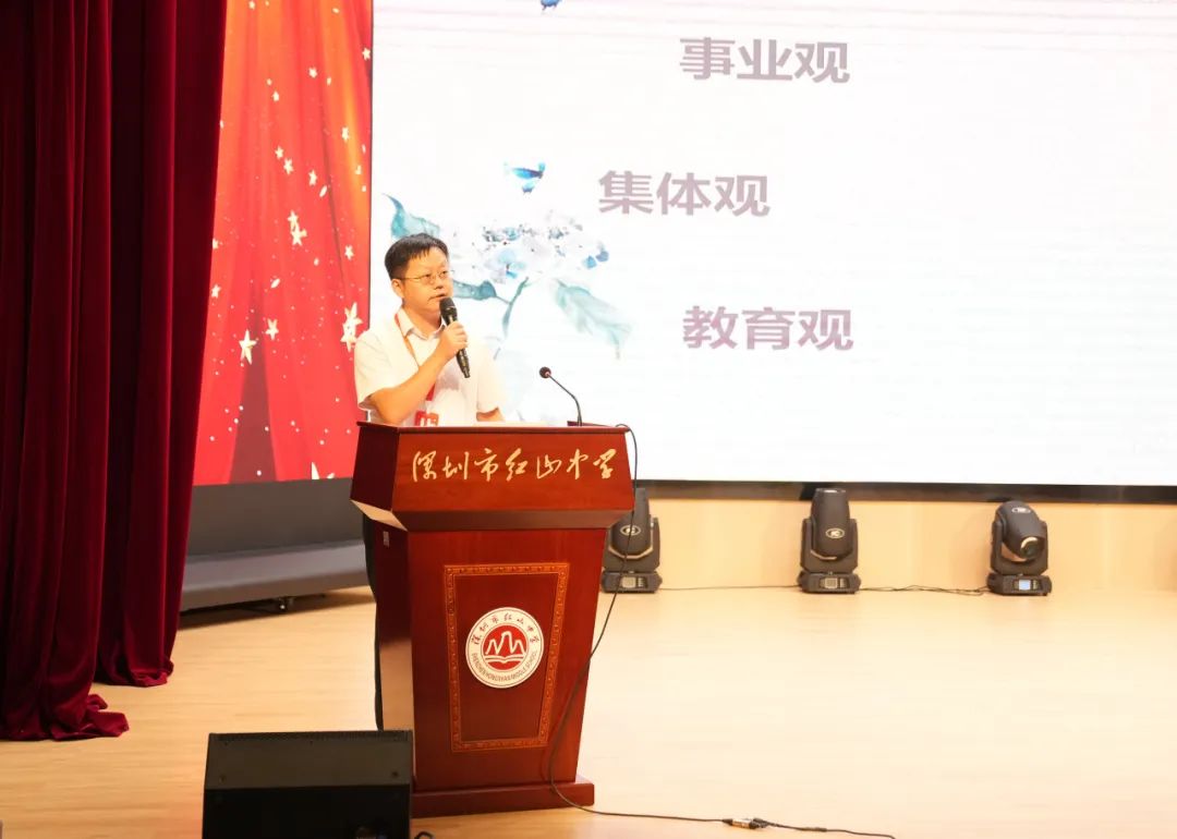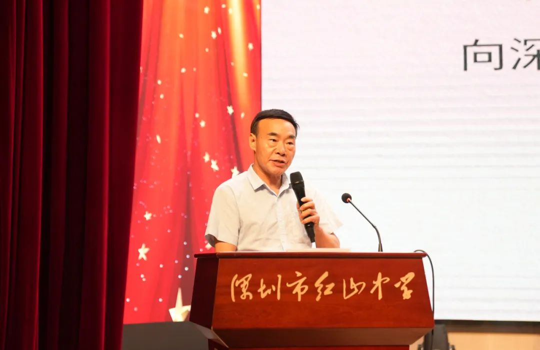 品牌红山 砥砺前行 校党总支邱小琴书记作总结讲话。邱书记首先对全体教职工的辛勤付出表示衷心的感谢,并肯定了学校过去三年办学历程中取得的成果。邱书记提出:红山人要敢想、敢闯、敢拼,要凝聚全校师生的力量推动学校高质量发展,打造红山品牌。邱书记强调:第一,坚持党建引领,推动学校工作上新台阶;第二,抓好两支队伍,促进教育教学上新水平;第三,加强建章立制,养成依规办事新习惯;第四,狠抓教学质量,争取明年高考有新突破;第五,做好保障工作,确保师生的幸福指数有新提升。邱书记号召全体教职工以教育家精神为追求,不忘初心、凝心聚力、潜心教育、深耕教育,以实干开启新征程,用奋斗描绘新篇章。 领导关怀 振奋人心 龙华区教育工委专职副书记、纪工委书记詹星耀专程前来红山中学为老师们加油鼓劲。詹书记表示,红山中学是龙华教育的一张名片,创校三年来,成绩斐然,特别是首届高考有不俗的表现。新学期,新起点,希望红山中学坚定落实立德树人根本任务,弘扬教育家精神,加强新时代高素质专业化教师队伍建设,重视师德师风建设,重视青年教师培养。他相信红山中学一定会越来越红、越来越旺、越来越好。