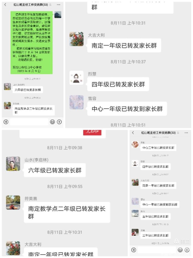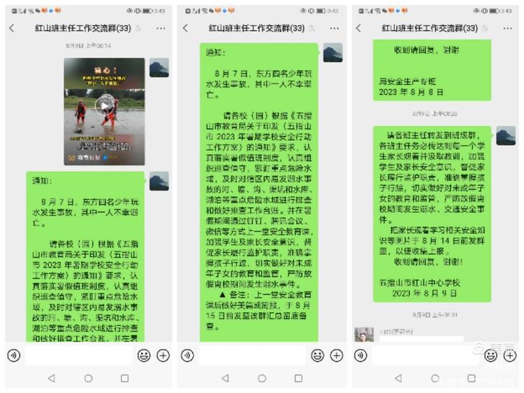 根据《五指山市教育局关于印发〈五指山市2023年暑期学校安全行动工作方案〉的通知》要求,为做好红山中心学校2023年暑假学生安全教育工作,结合我校实际,我校于2023年8月9日晚上利用家长微信群开展了一次暑期安全教育课,其目的是为了提高家长和学生的安全意识,提醒家长作为监护人要尽到监护责任,在防溺水和交通安全方面要提高警惕,防患于未然,随时维护孩子的健康和安全利益。通过组织学习,切实加强学生了防溺水和交通的安全教育,有效防止溺水及交通事件的发生,全面增强学生的安全防范意识。
